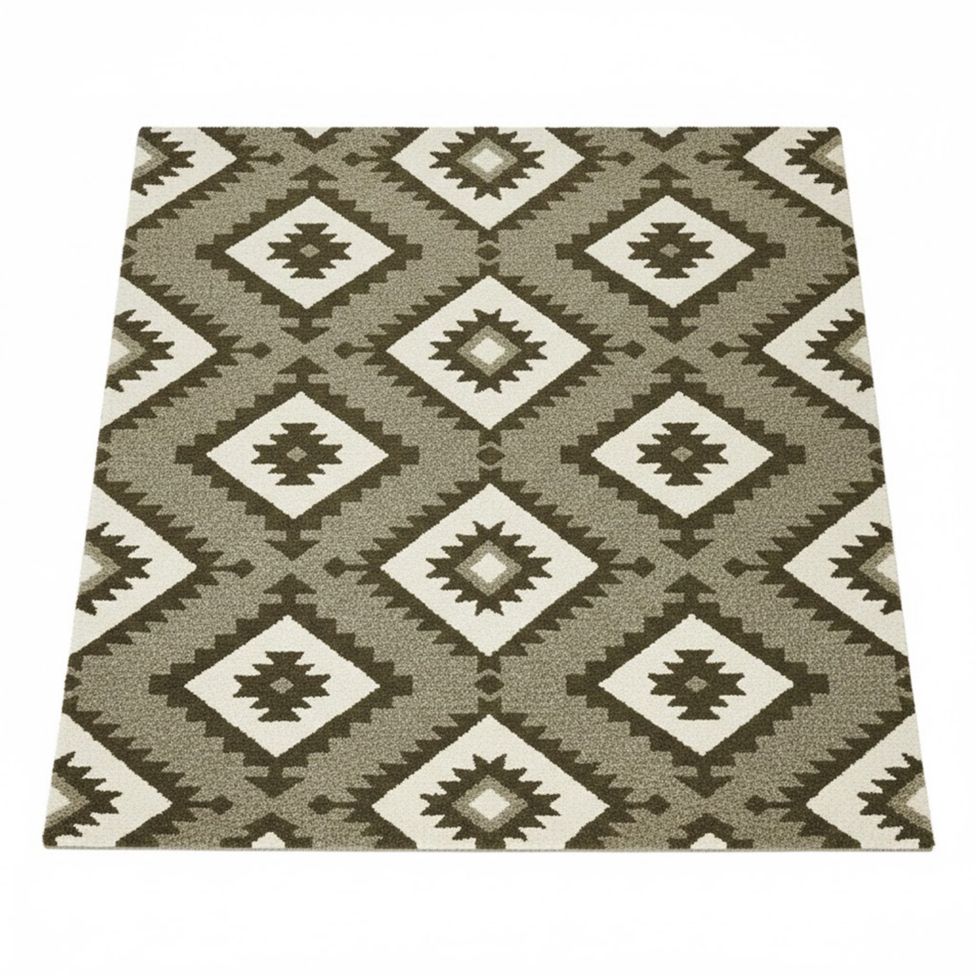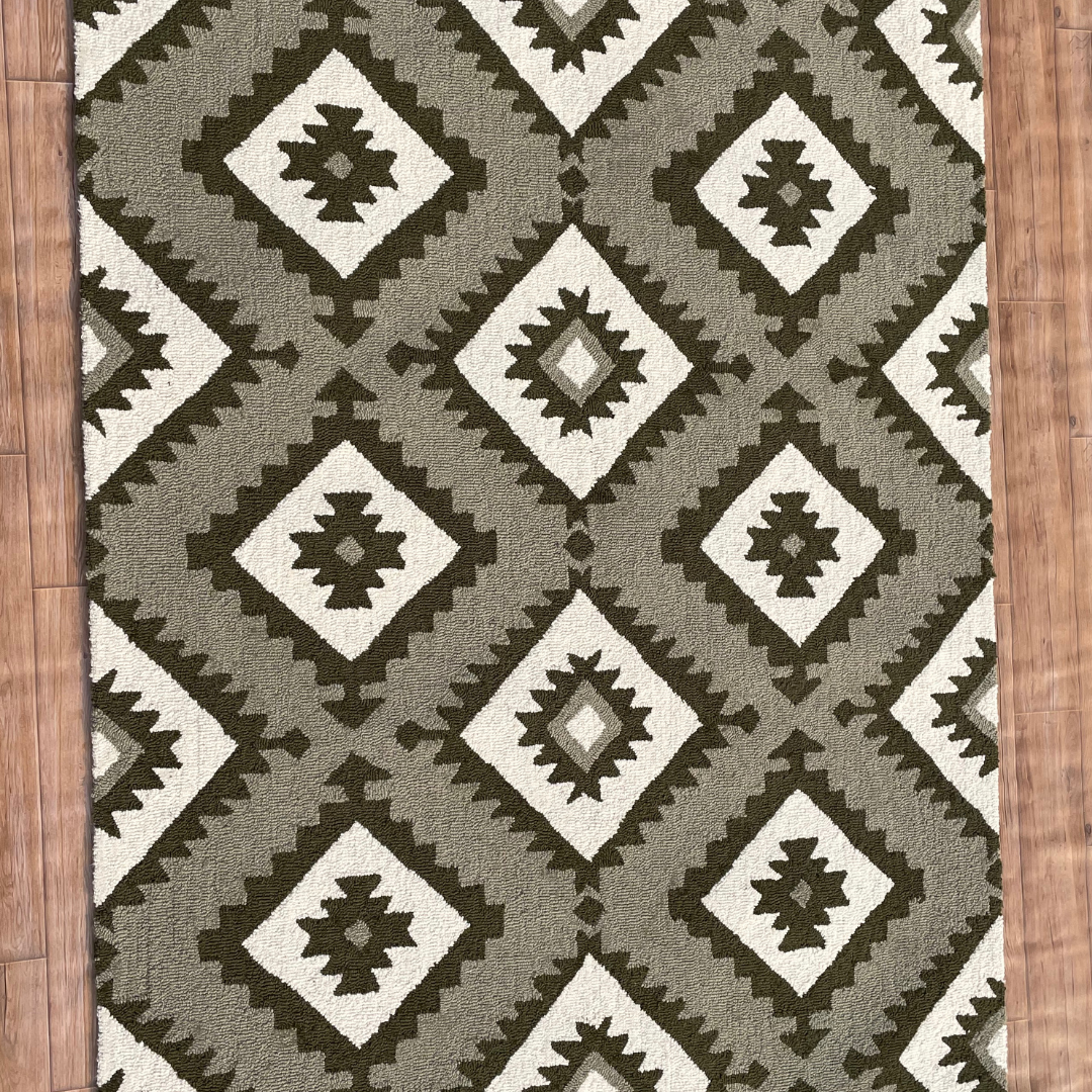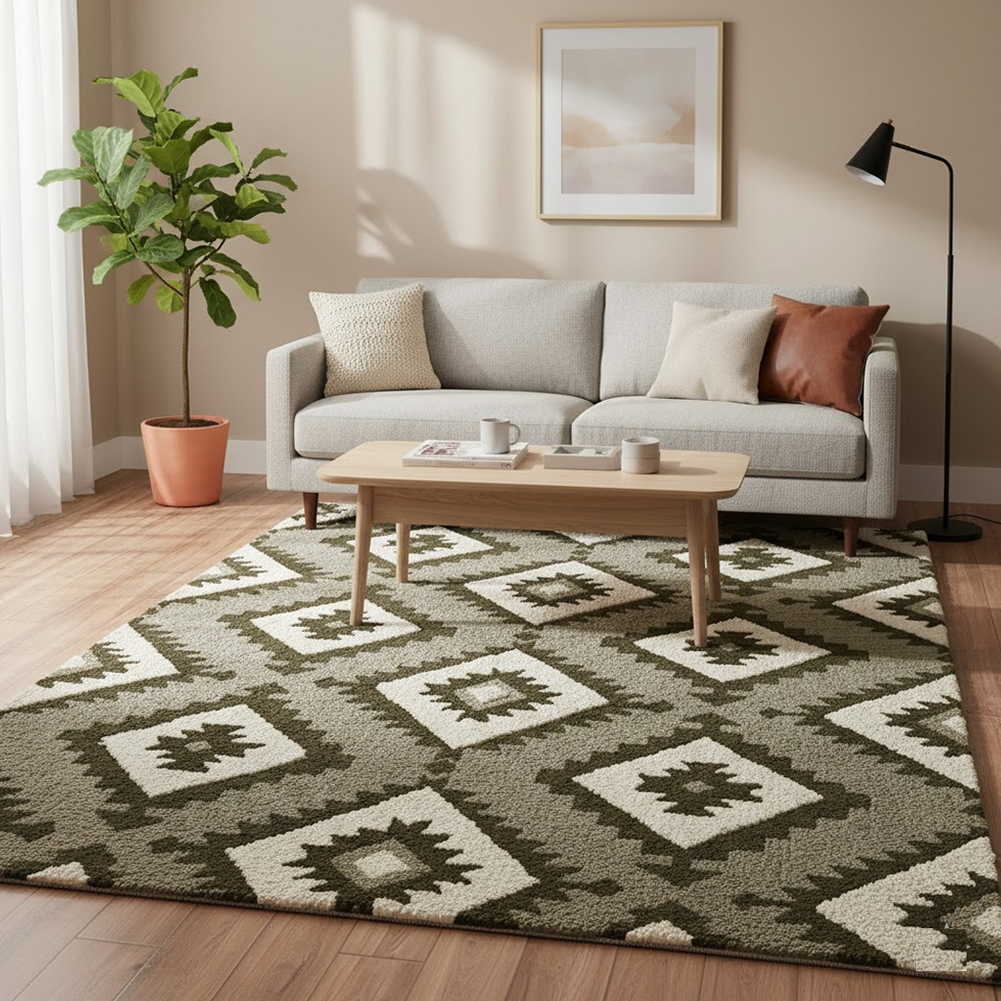 In the ancient weaving enclave of Bhadohi, the artisans of Rugs & Roses have spun a vibrant tale with the Aztec Echo (Jadelle). Inspired by the untamed beauty of Southwestern American landscapes, this hand-tufted carpet breathes life into the bold geometric designs of Native American heritage. Its intricate diamonds and zigzags, set against a lush green palette with subtle accents, evoke the spirit of desert oases and sacred traditions, reimagined with a fresh, modern pulse.