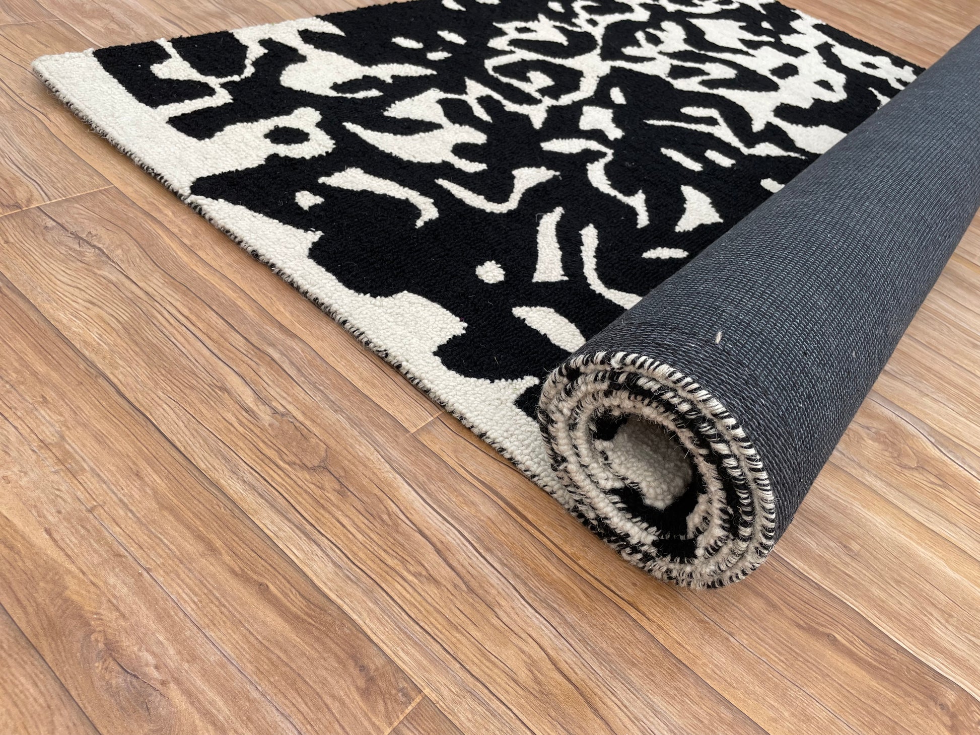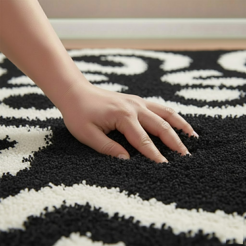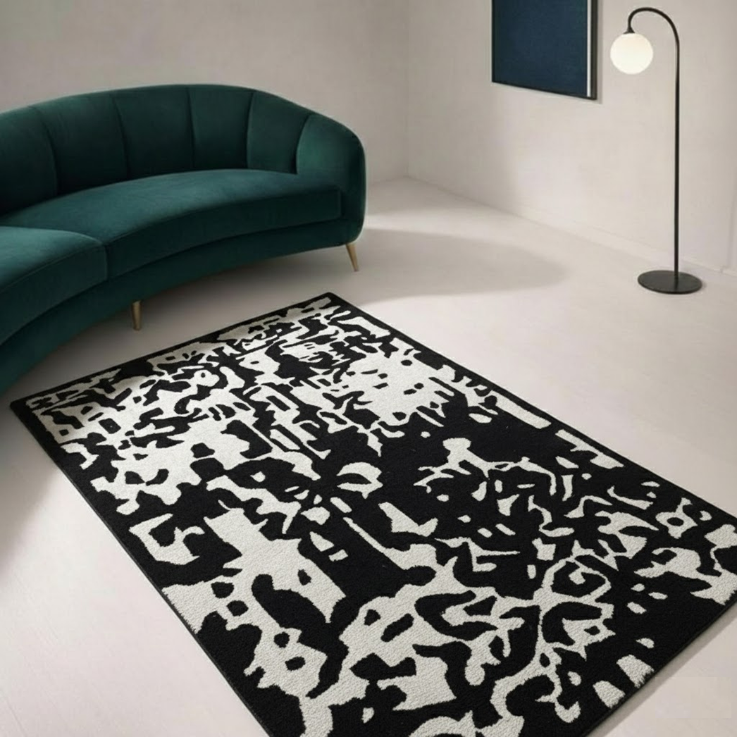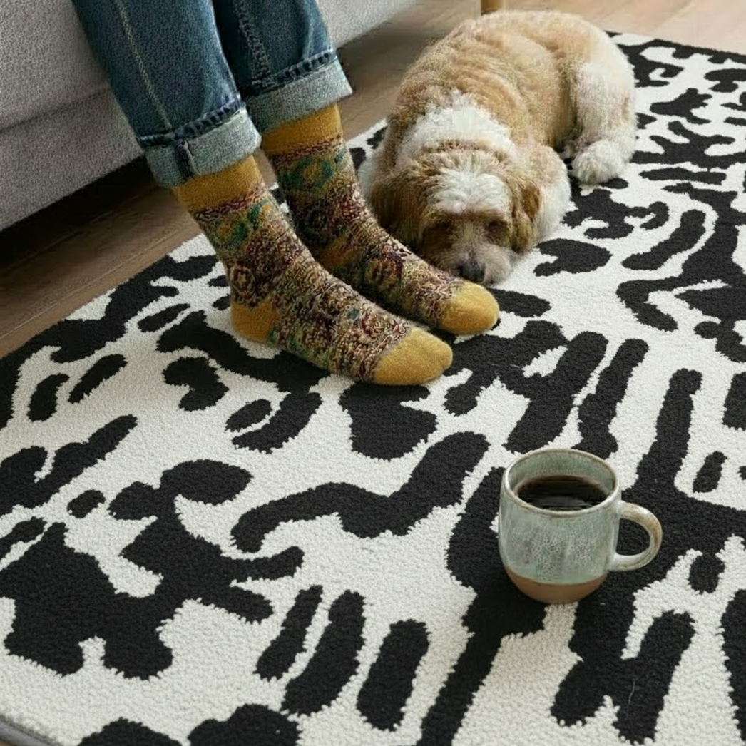 The Black Moo Cascade invites you to sink into its velvety embrace, with a plush 60-thread-count pile and a 10-mix blend that delivers unparalleled softness and enduring strength. Its dynamic black-and-cream pattern weaves a striking yet serene aesthetic, transforming contemporary, eclectic, or minimalist spaces into havens of untamed elegance. Anchored by a sturdy cotton canvas backing, this rug offers non-slip stability, ensuring its beauty endures through the chapters of your home’s story.