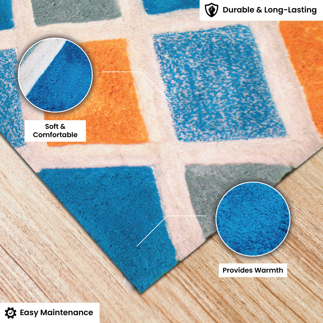 Unleash your free spirit with the Boho Checkmate, a luxurious shaggy carpet from Rugs & Roses that captures the essence of bohemian aesthetics. Crafted from ultra-soft microfiber yarn using precision power loom techniques, this striking piece features a bold check pattern in vibrant orange, cool blue, and crisp white, delivering an artistic flair that transforms any space into a boho-inspired haven.