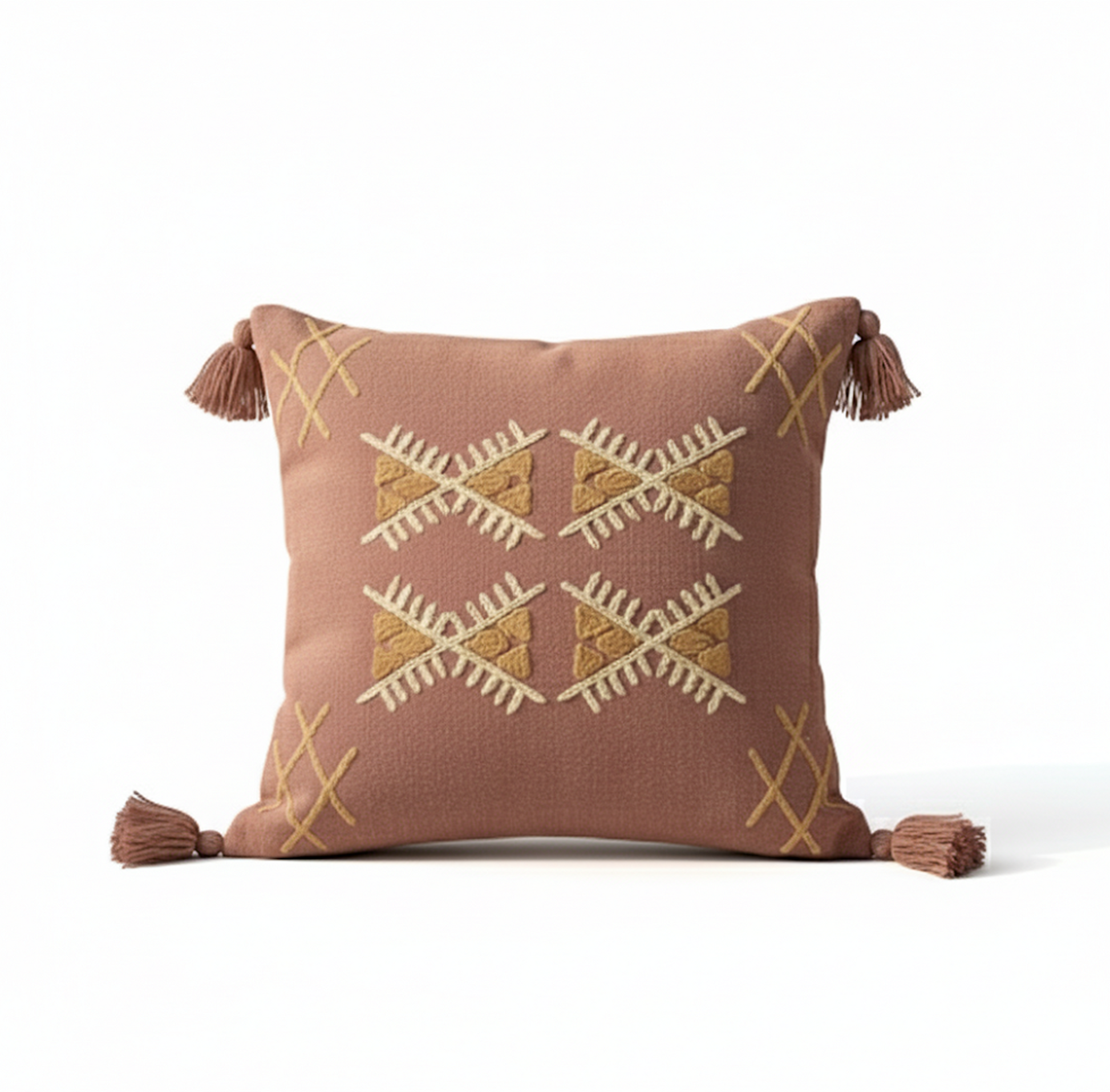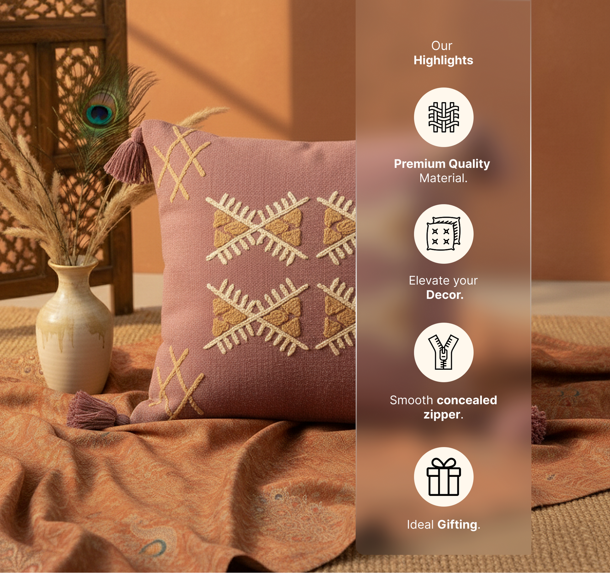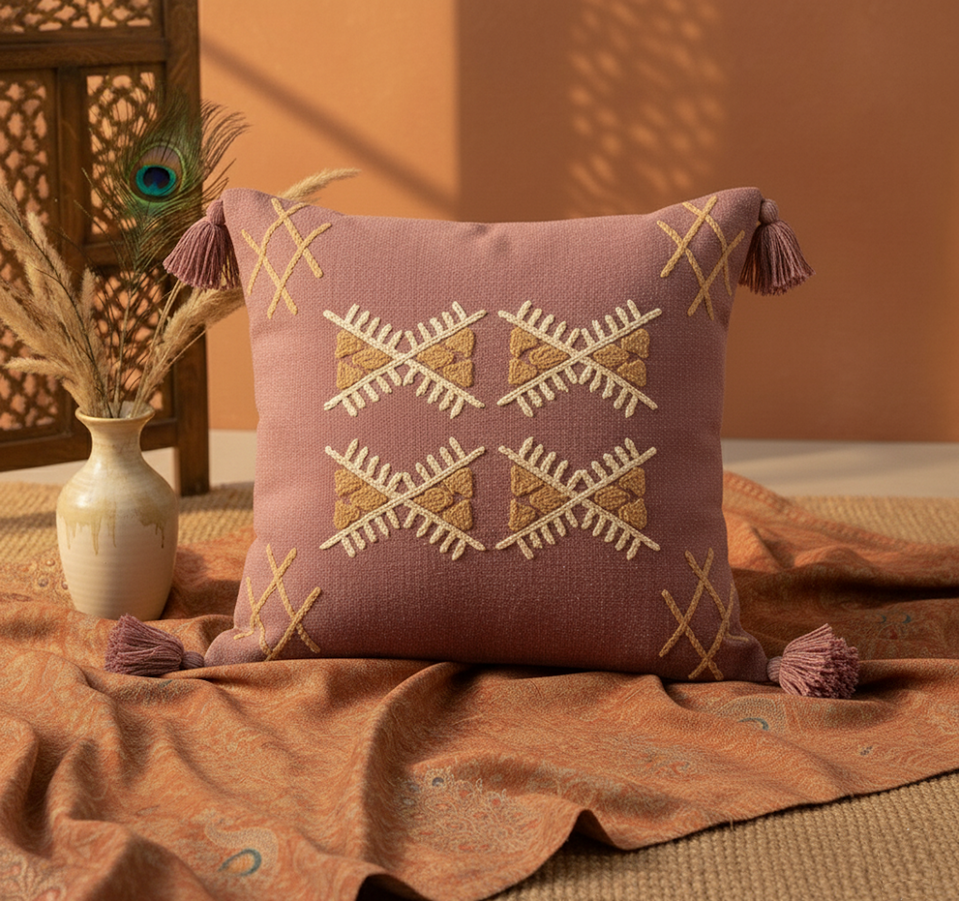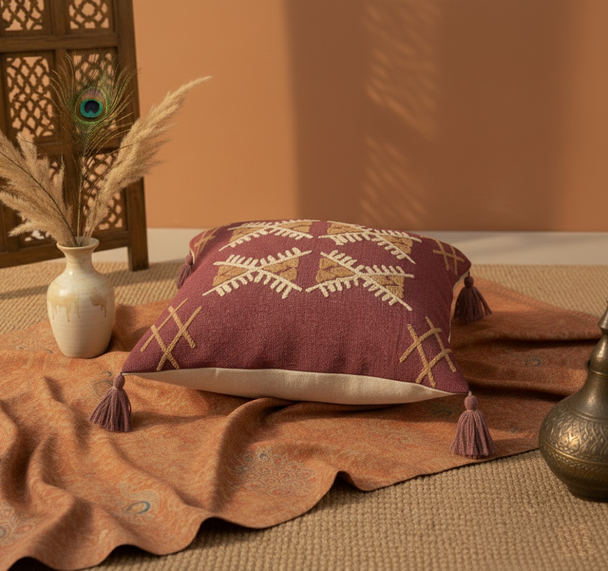 Indulge in the luxurious comfort of our Claret Cushion Cover, featuring a rich deep reddish-pink base adorned with intricate beige and light brown patterns that exude boho charm. This exquisite piece from Rugs & Roses infuses any living space with elegance and warmth, handcrafted by skilled Panipat artisans from high-quality materials for a soft, supportive feel—perfect for unwinding after a long day. Whether gracing your sofa, armchair, or bed, it becomes a beloved accent, blending timeless style with cozy allure.