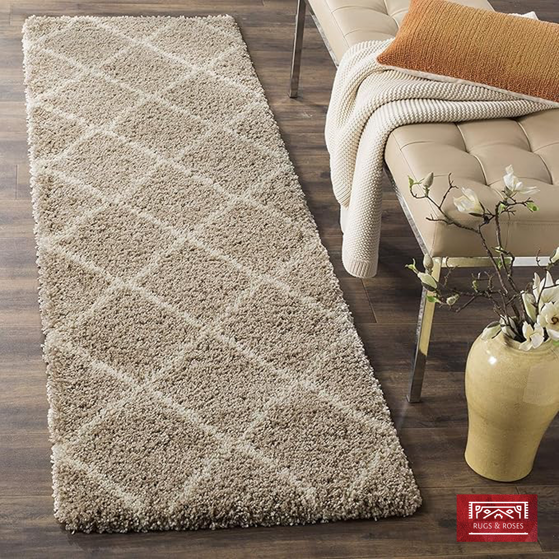 Unveil the luxurious charm of Boho Classic Checks, a shaggy masterpiece from Rugs & Roses that marries Bohemian flair with modern sophistication. Expertly crafted from ultra-soft microfiber yarn using advanced power loom techniques, this rug showcases a timeless checkered pattern with crisp white check lines set against a warm beige-light brown sandstone background. Its versatile design adds depth and character, making it an ideal addition to contemporary, minimalist, or transitional interiors.