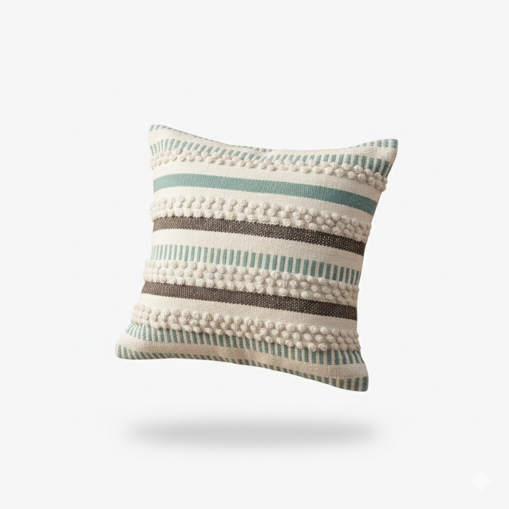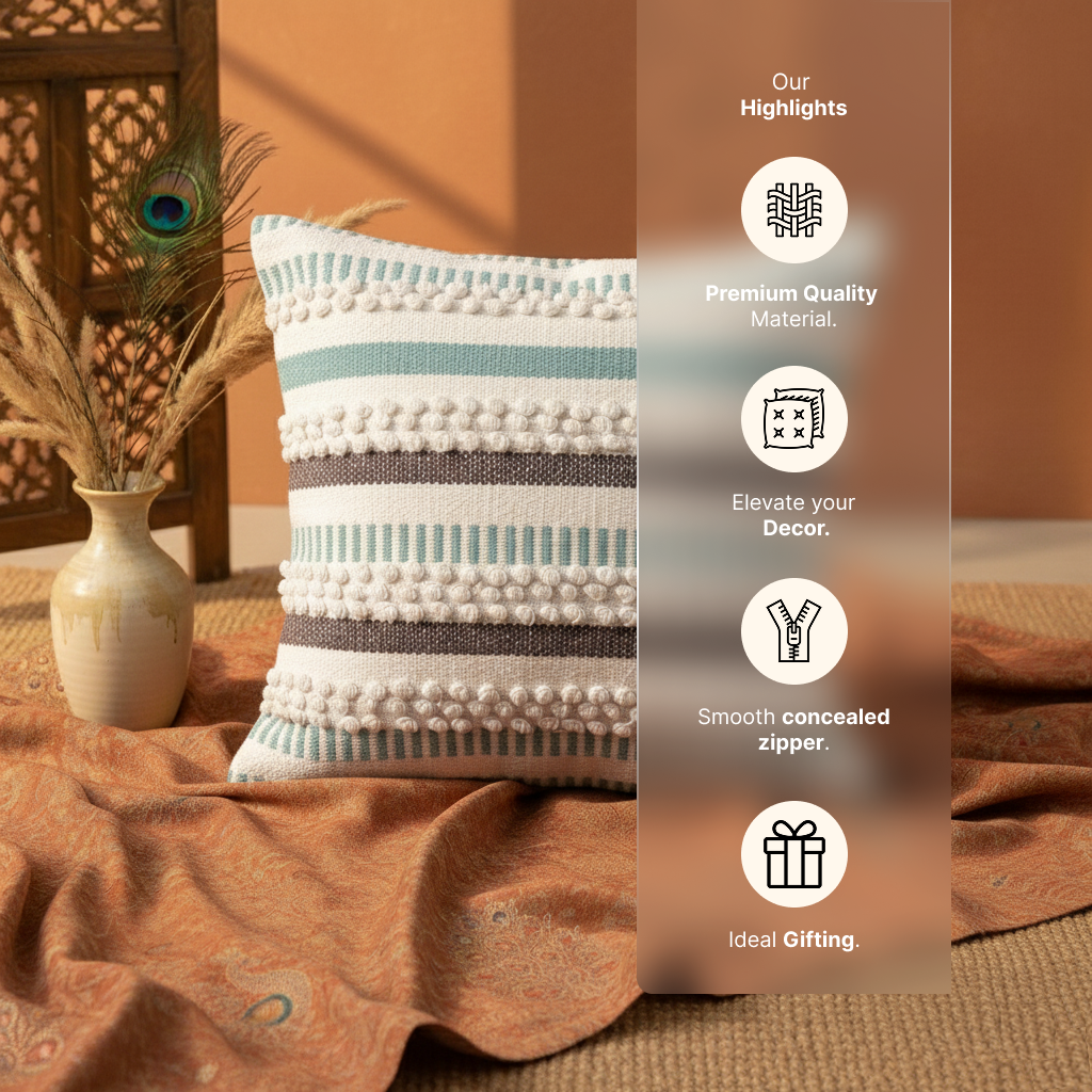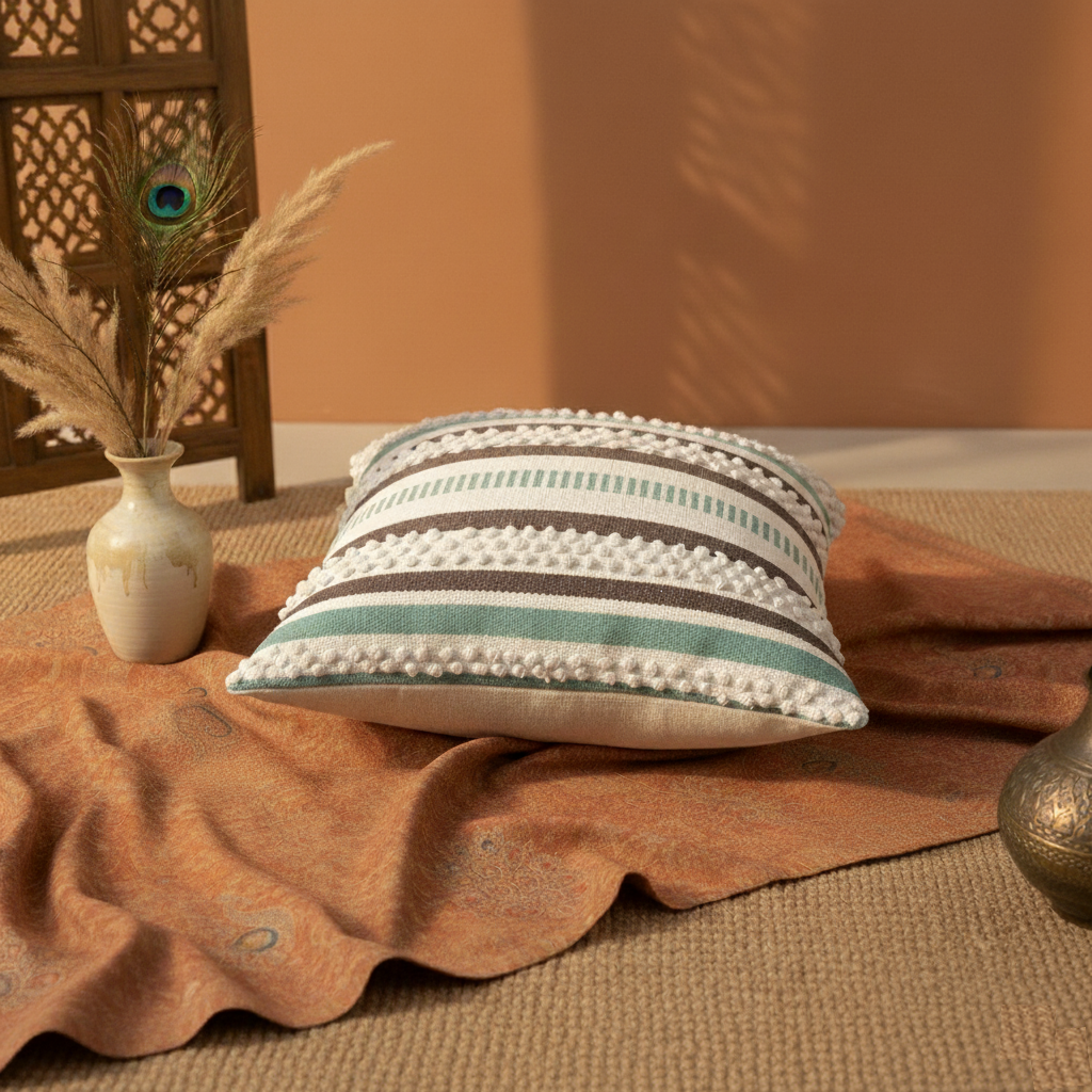 Transform with the Cotton Charm Cushion Cover – Boho Elegance by Rugs & Roses!! Revamp your cushions with the eye-catching "Cotton Charm" Cushion Cover by Rugs & Roses. Handcrafted by skilled Panipat artisans from high-quality materials, this standout piece features alternating stripes and woven textures in white, teal, and brown, offering a unique blend of colors and patterns that add a bold pop of style to your sofa, chair, or bed.