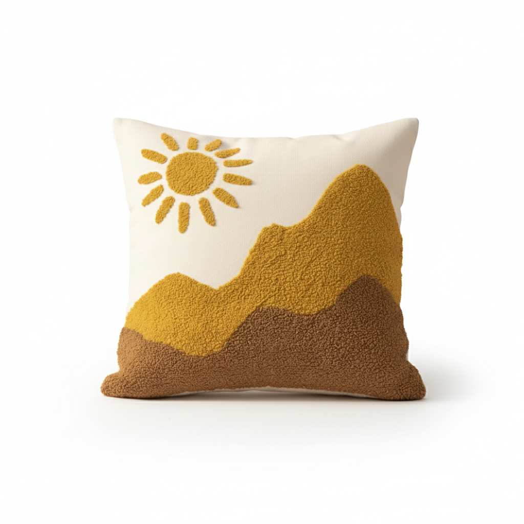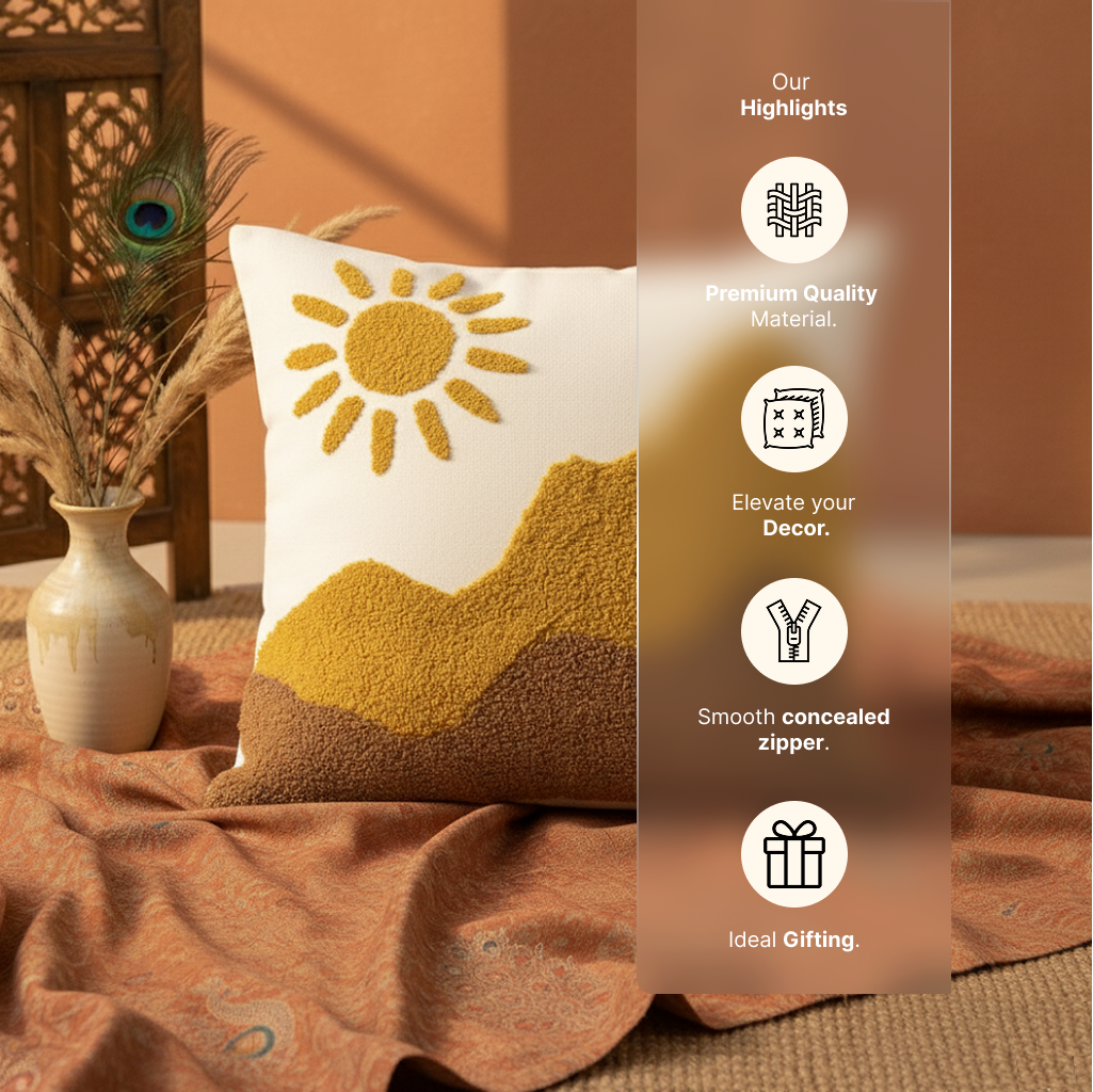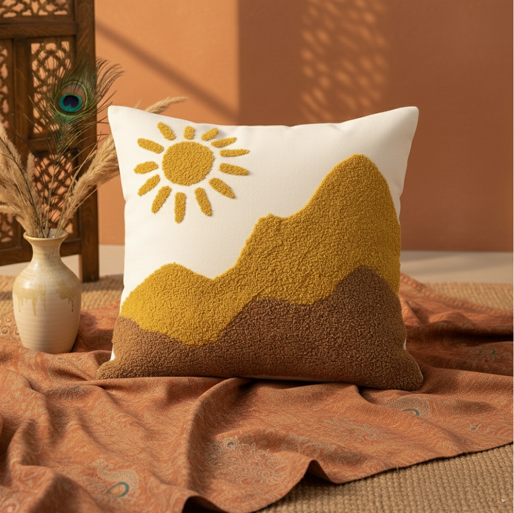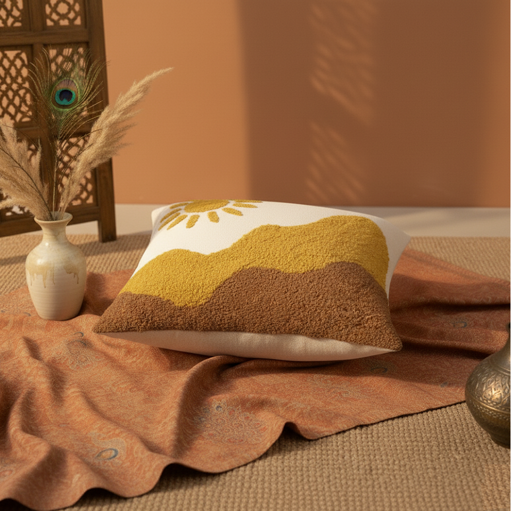 Radiate with the Golden Hour Cushion Cover – Boho Warmth by Rugs & Roses!! Infuse warmth and style into your living space with the Rugs & Roses "Golden Hour" Cushion Cover. This exquisite piece, handcrafted by skilled artisans from Panipat, India, brings a touch of elegance and comfort to any room. The design features a mesmerizing wave-like pattern in soothing shades of brown and yellow, reminiscent of a serene sunset.