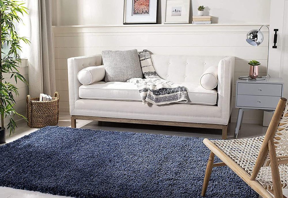 Step into plush luxury with LushLoom Indigo, a stunning dark blue shaggy carpet from Rugs & Roses’ Minimalistic Collection. Handcrafted by Bhadohi’s skilled artisans using advanced power loom techniques, this single-color masterpiece is spun from ultra-soft microfiber yarn, featuring a 1-2 inch deep pile that delivers unrivaled comfort. With a high-density cotton backing, it ensures durability, non-slip stability, and timeless resilience.