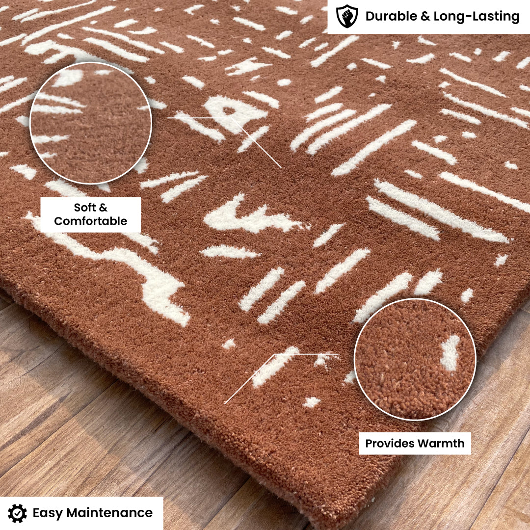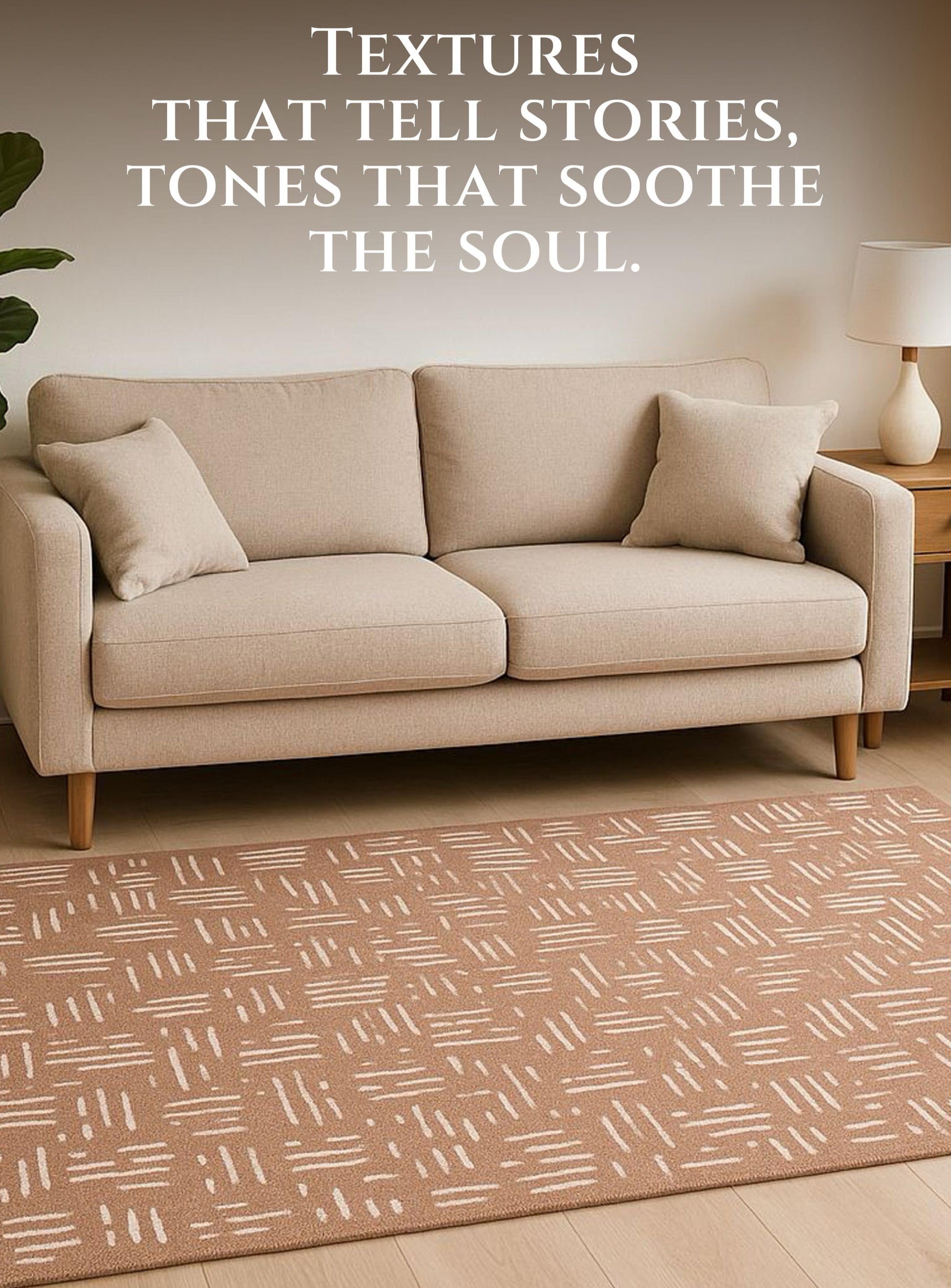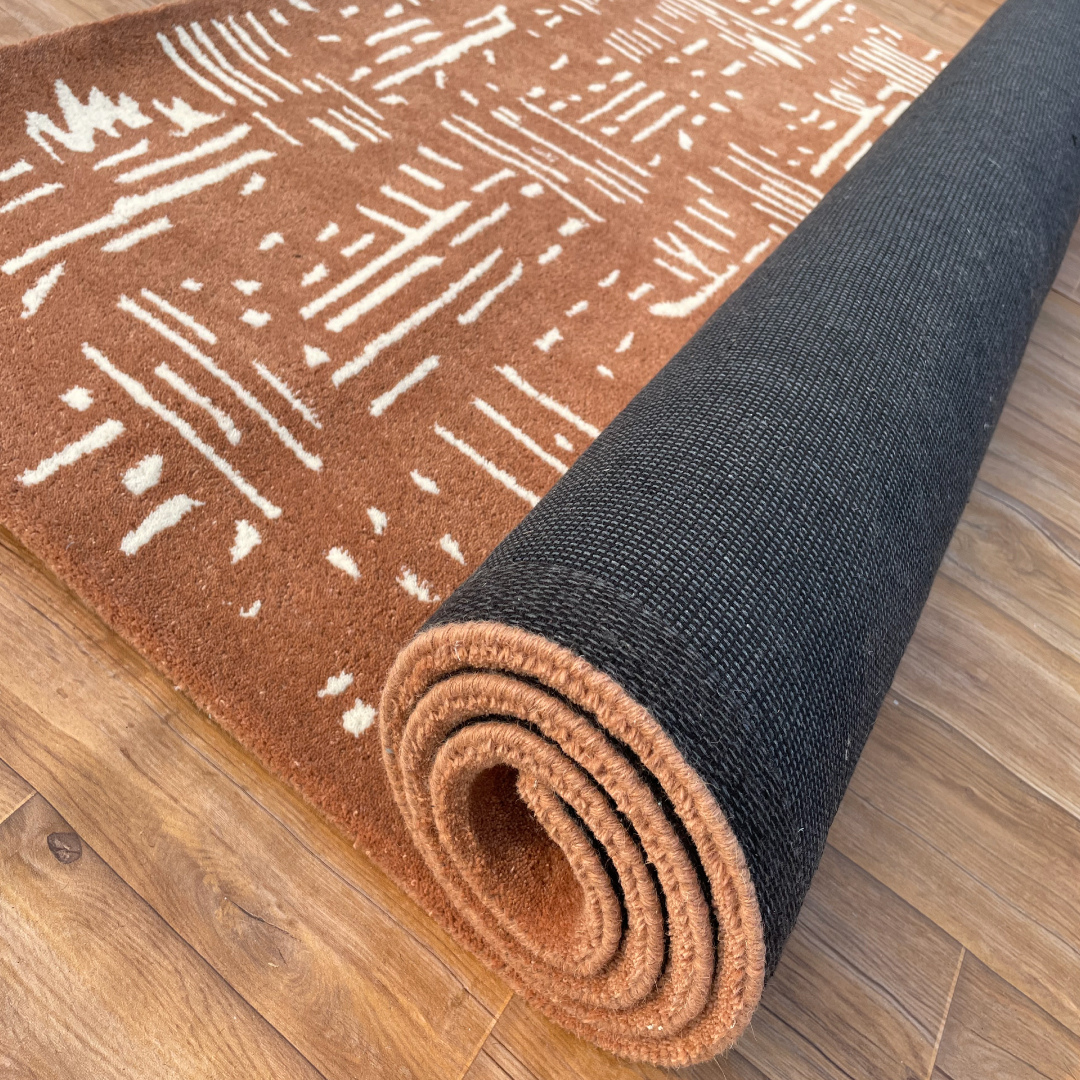 In the ancient weaving haven of Bhadohi, the artisans of Rugs & Roses have crafted a rug that sings of distant Moroccan sunsets: the Moroccan Hash (Terracotta). This hand-tufted masterpiece captures the warmth of desert earth, with delicate ivory lines weaving gracefully like ancient Moroccan contours across a rich terracotta-rust base. Woven from premium New Zealand wool using a luxurious loop pile technique, this rug is a vibrant fusion of exotic heritage and contemporary elegance.