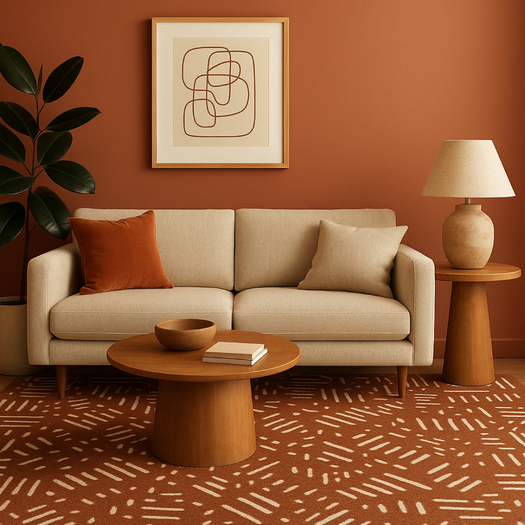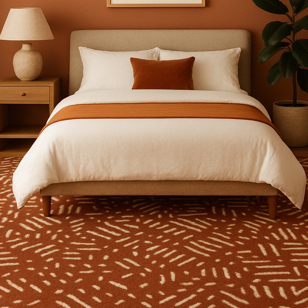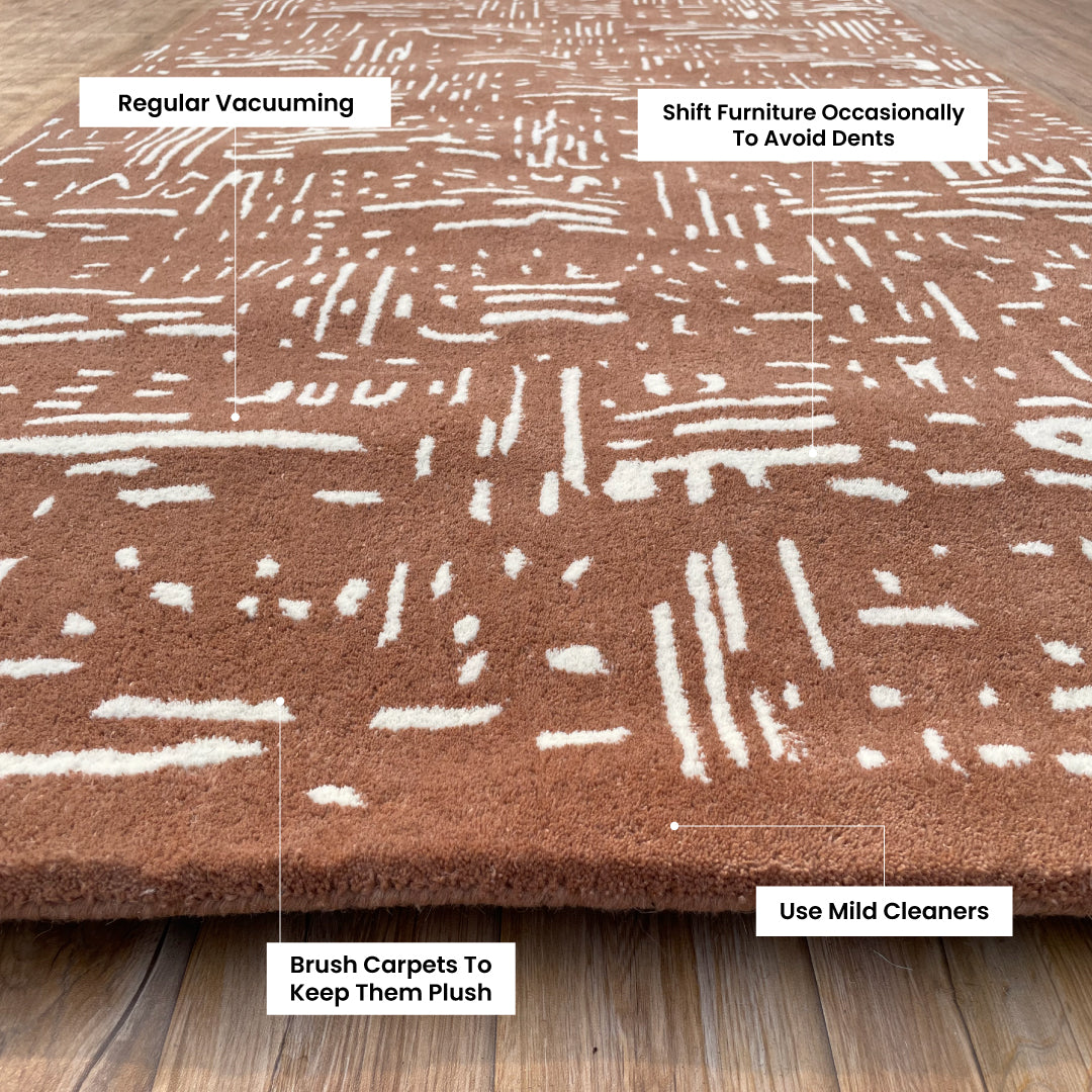 In the ancient weaving haven of Bhadohi, the artisans of Rugs & Roses have crafted a rug that sings of distant Moroccan sunsets: the Moroccan Hash (Terracotta). This hand-tufted masterpiece captures the warmth of desert earth, with delicate ivory lines weaving gracefully like ancient Moroccan contours across a rich terracotta-rust base. Woven from premium New Zealand wool using a luxurious loop pile technique, this rug is a vibrant fusion of exotic heritage and contemporary elegance.