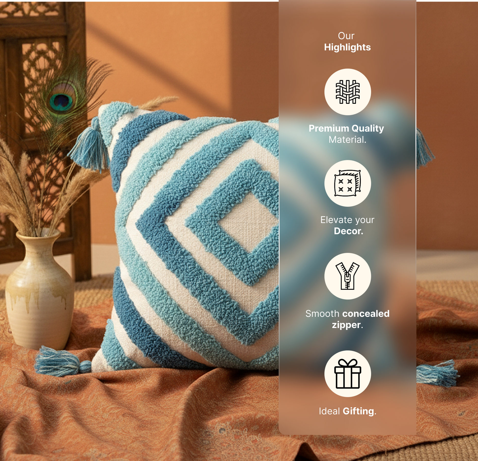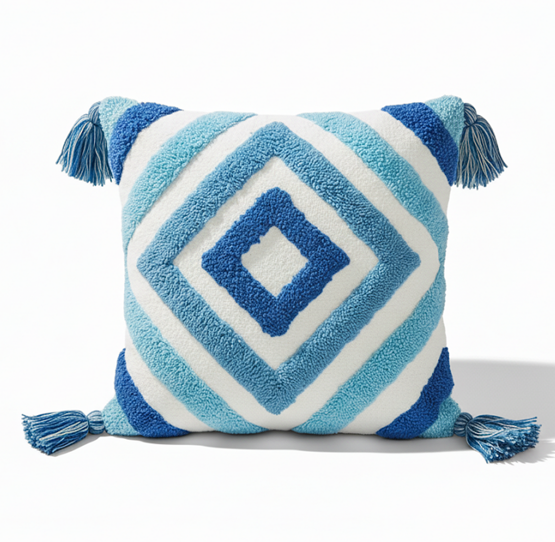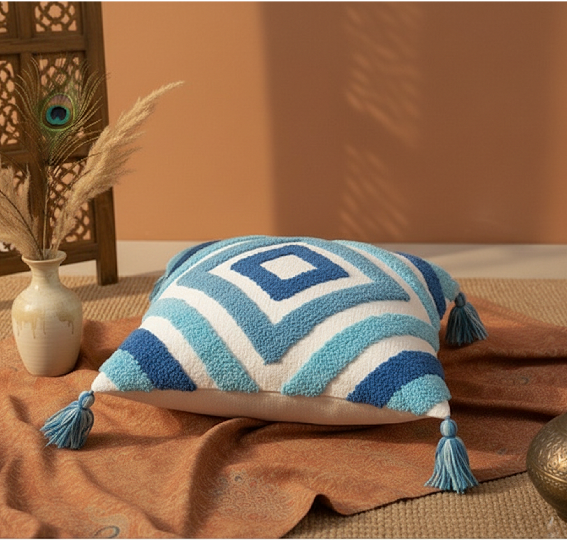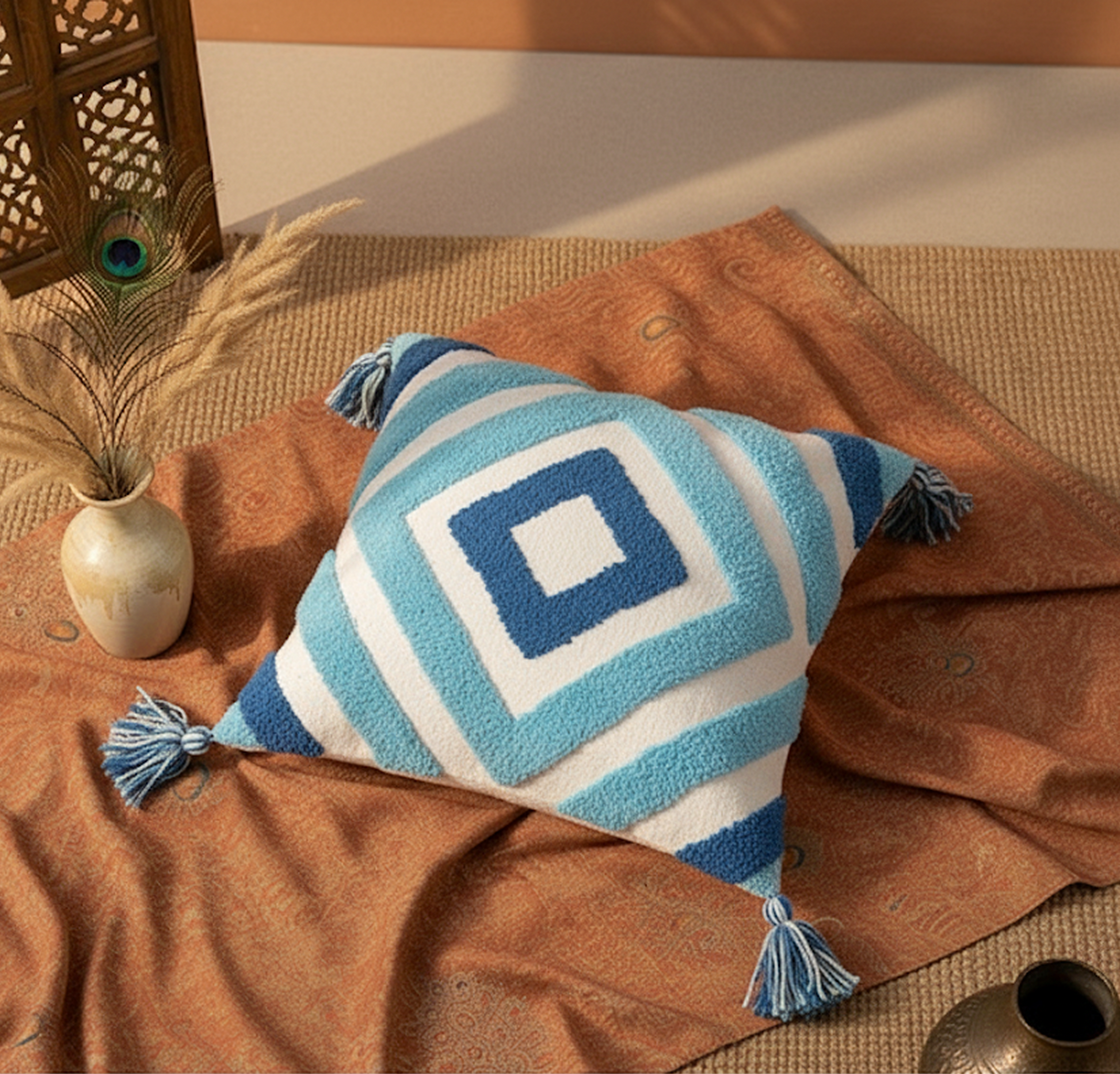 Bring the serenity of sea into your home with the Oceania cushion cover from Rugs and Roses. This elegant cover features a calming blend of boho blues and whites in a sophisticated diamond pattern. The geometric design evokes the peacefulness of ocean waves,adding a refreshing coastal touch to your decor. Made by Panipat's artisans from high quality durable fabric, Oceania is designed for both style and longevity.