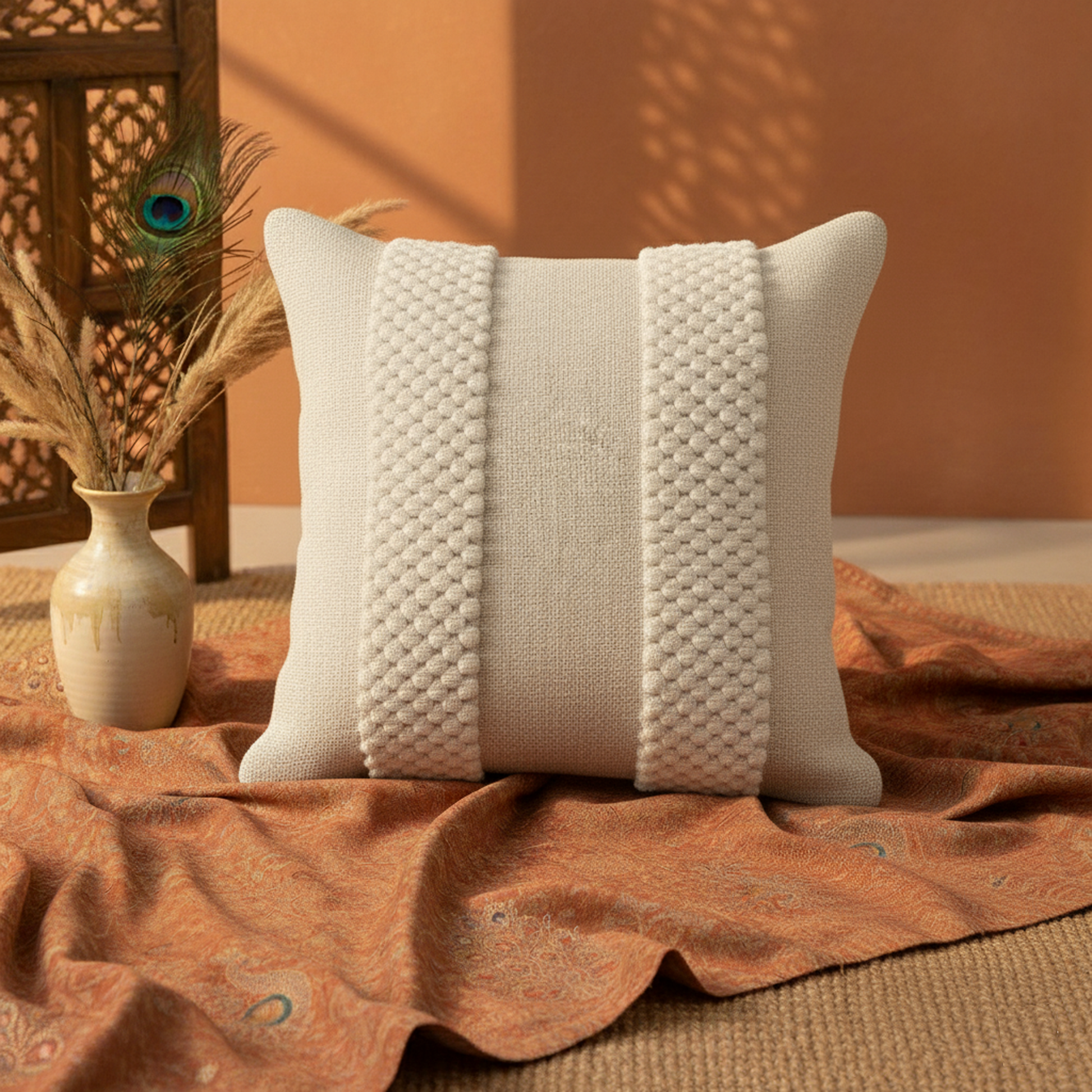 Handcrafted with love by skilled artisans in Panipat, the Pearl Heaven Cushion Cover in pristine white with an elegant self-design offers a serene and tactile delight. Its subtle textured pattern, accented with delicate self-weave details, creates a harmonious blend of sophistication and comfort. Adorned with graceful tassels at each corner, this cover infuses any living space with timeless charm and a cozy elegance, perfectly merging traditional craftsmanship with modern allure.