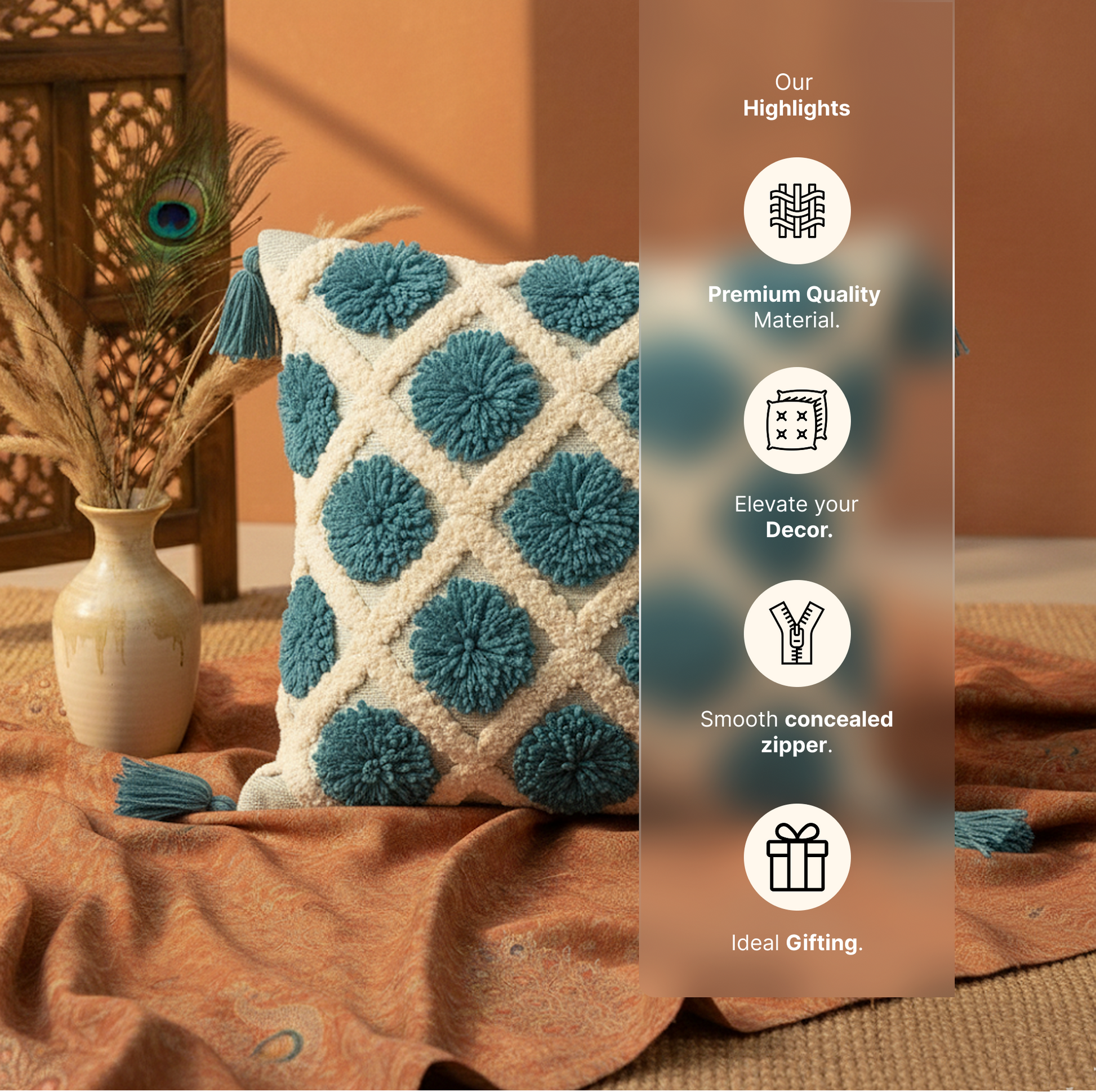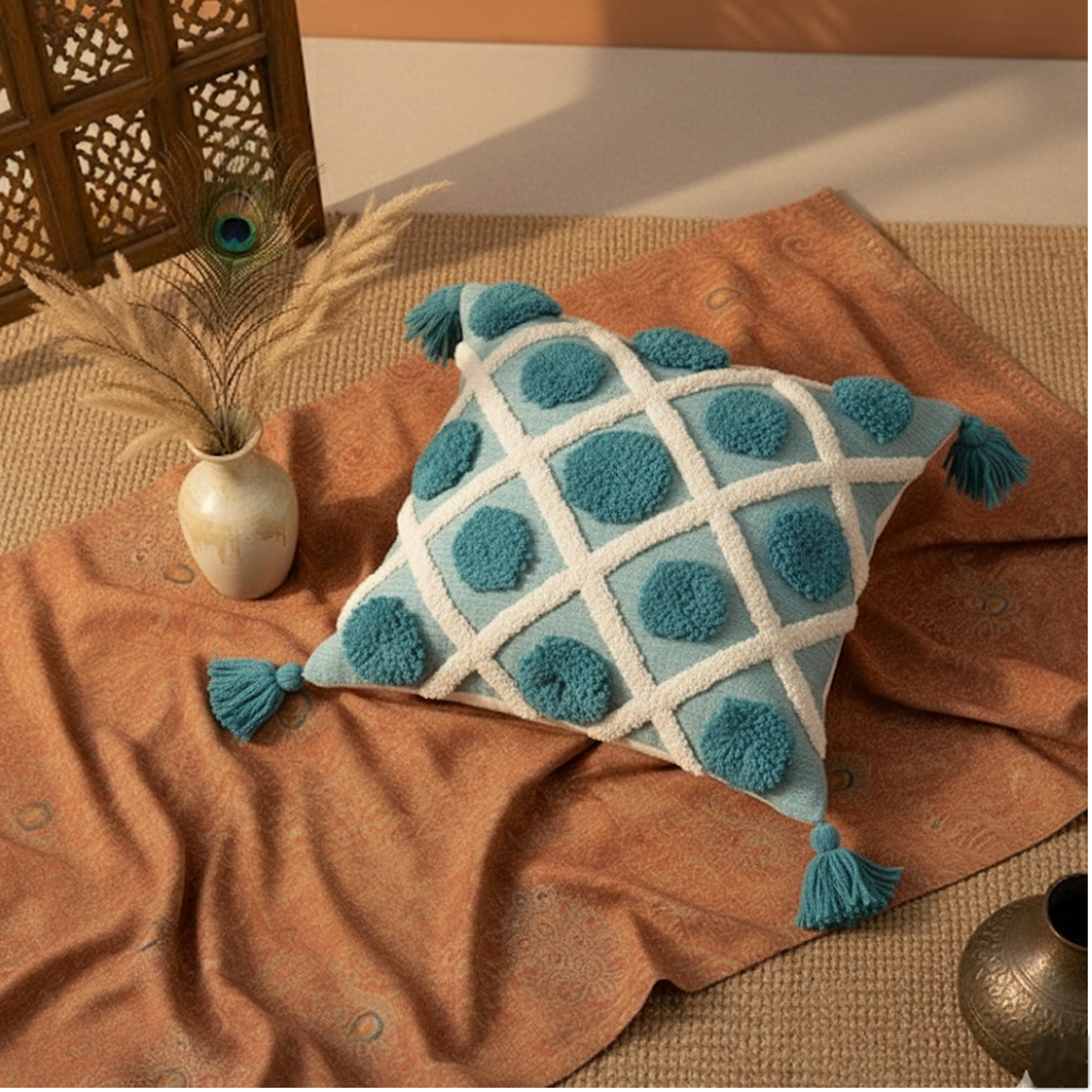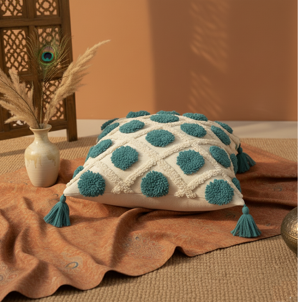 Unveil the Pom-Pom Grid Cushion Cover – Playful Boho Charm by Rugs & Roses!! Add a playful and stylish touch to your home with the Pom-Pom Grid Cushion Cover from Rugs & Roses. Handcrafted with love by Panipat’s artisans, this unique design features a delightful grid of teal pom-poms set against a soft, neutral background, bringing a cozy and inviting vibe to any room. Perfect as an accent piece for your sofa, armchair, or bed, it infuses your space with whimsical elegance and boho flair.