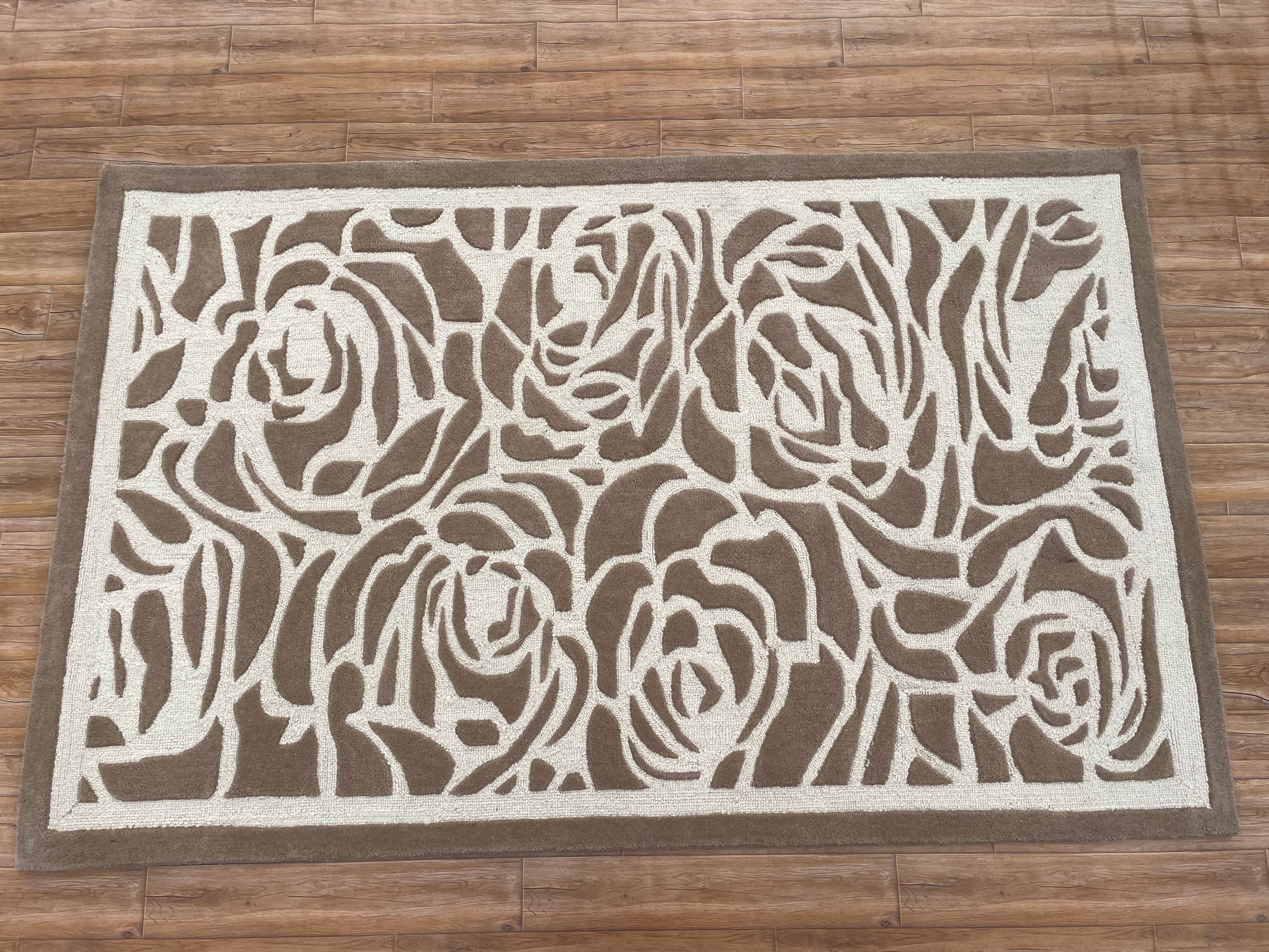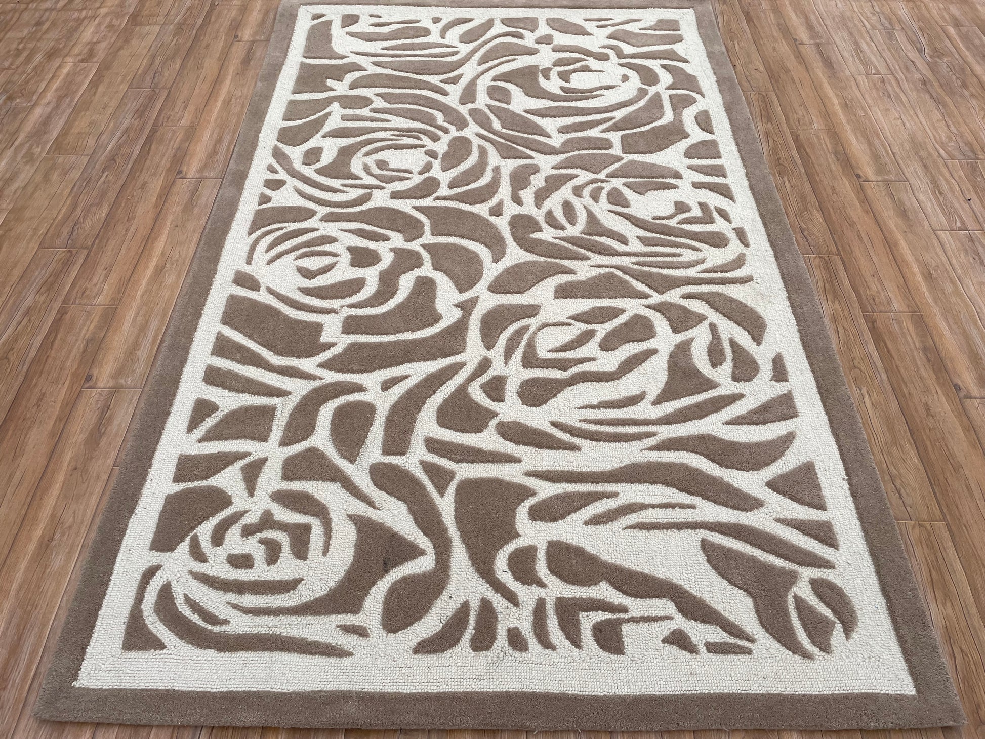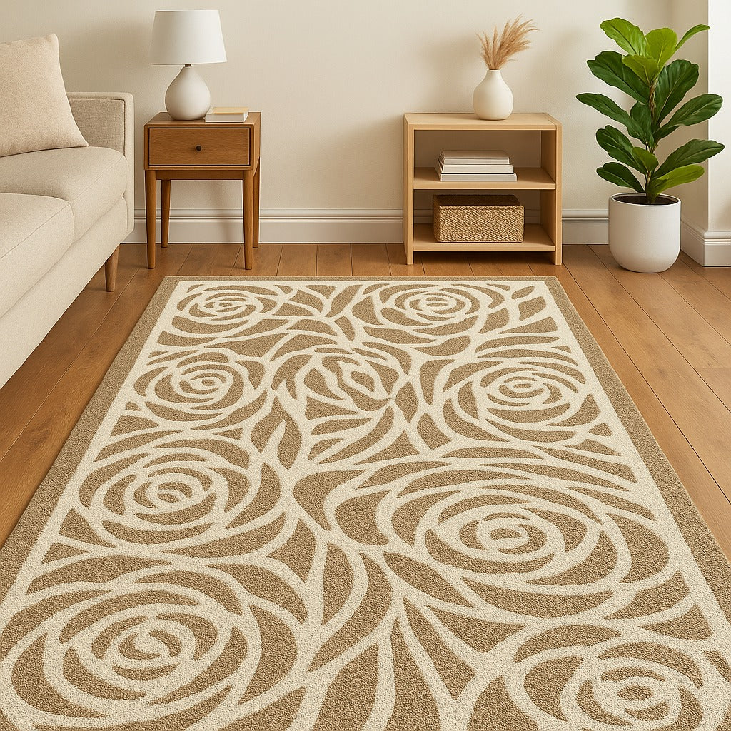 Step into its luxurious embrace, where the plush pile invites you to linger in comfort, supported by a sturdy cotton canvas backing that ensures lasting strength and non-slip stability. The Rosette Charm’s neutral palette, with its warm beige roses and soft ivory backdrop, crafts a versatile yet captivating design that elevates contemporary, classic, or minimalist spaces with effortless grace. This carpet is more than a floor covering—it’s a story of nature’s elegance woven into your home.