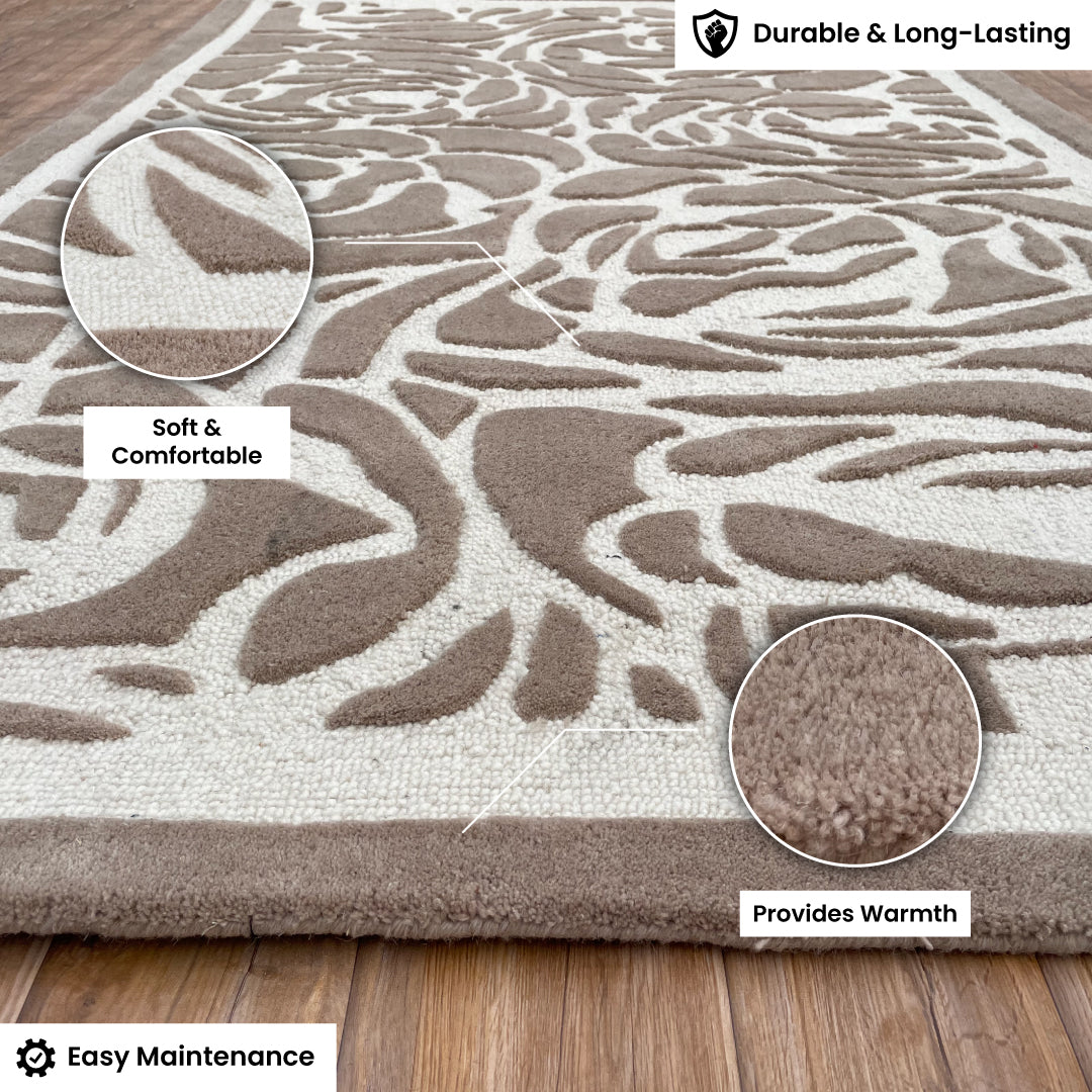 In the ancient weaving haven of Bhadohi, where artistry blooms like a perennial garden, the skilled artisans of Rugs & Roses have crafted a masterpiece that whispers of timeless beauty: the Rosette Charm. This hand-tufted carpet weaves delicate beige rose sketches across a serene ivory/off-white base, evoking the gentle elegance of a blooming meadow. Crafted from premium New Zealand wool with a masterful blend of loop and cut pile techniques, its 60 and 10 thread-count mix creates a rich, tactile texture that brings the intricate floral impressions to life, marrying classic charm with modern sophistication.