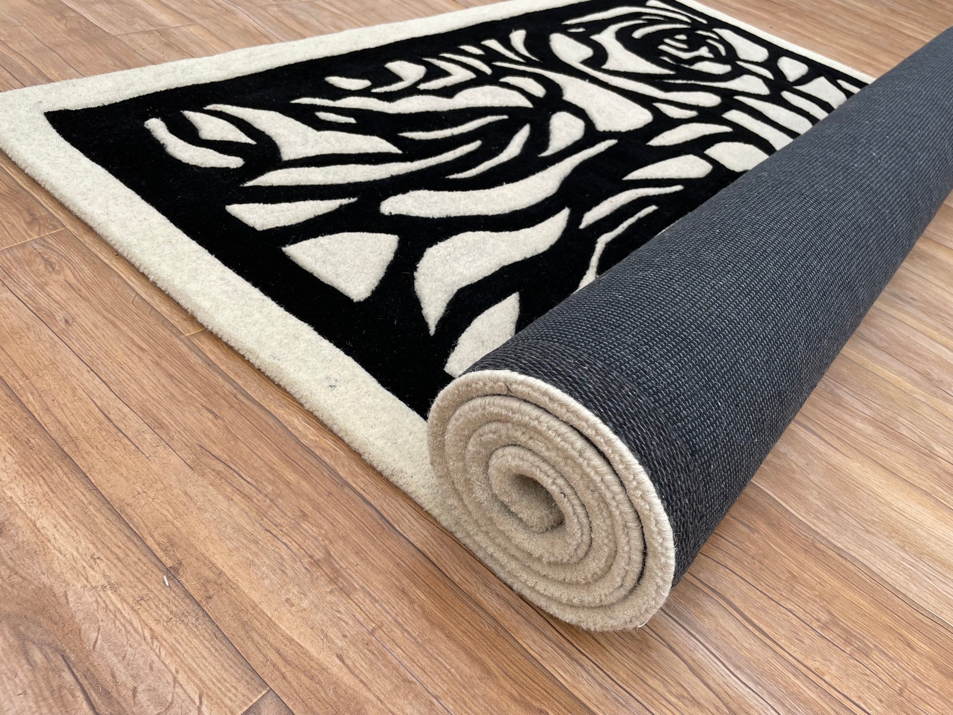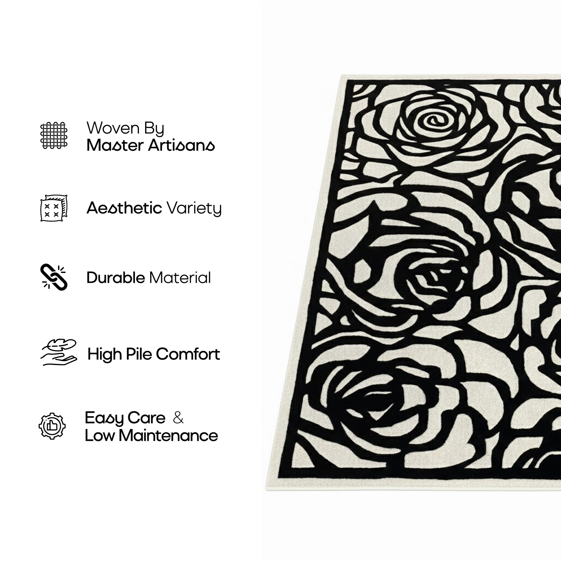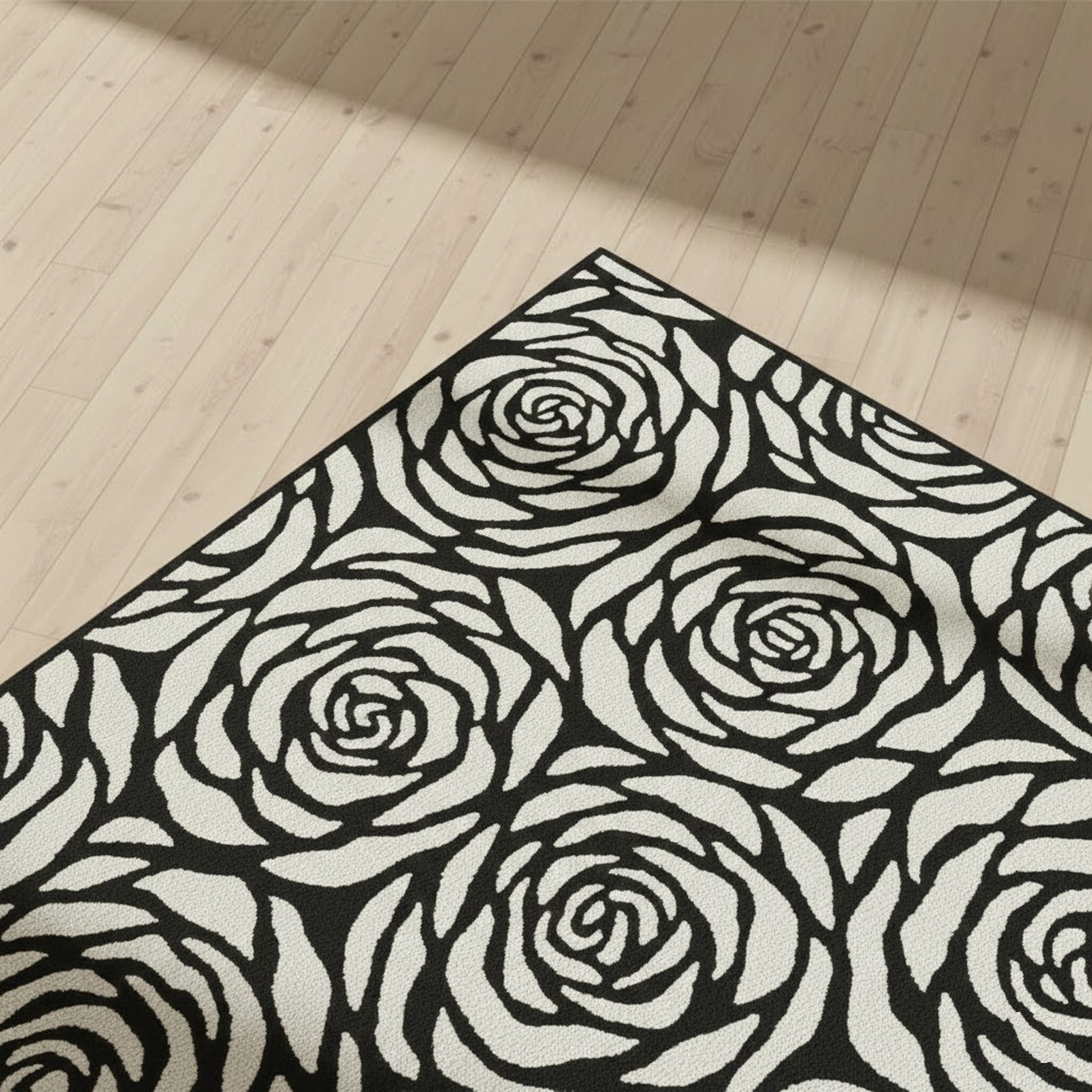 Step into its luxurious embrace, where the plush pile beckons you to pause in comfort, supported by a sturdy cotton canvas backing that ensures enduring strength and non-slip stability. The Rosette Charm (Noir), with its striking noir and off-white palette, crafts a captivating yet serene design that elevates contemporary, classic, or minimalist interiors with effortless allure. This carpet is more than a furnishing—it’s a story of shadowed beauty woven into your home.