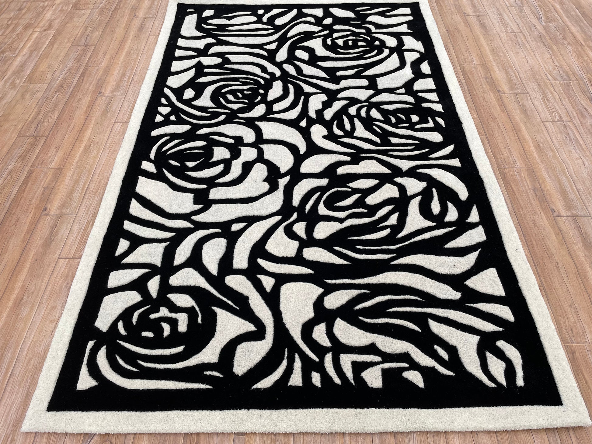 In the ancient weaving heart of Bhadohi, where artistry blooms under the cloak of night, the skilled artisans of Rugs & Roses have crafted a masterpiece of enigmatic elegance: the Rosette Charm (Noir). This hand-tufted carpet weaves delicate noir rose sketches across a luminous off-white base, evoking the mysterious beauty of a midnight garden. Crafted from premium New Zealand wool with a seamless blend of loop and cut pile techniques, its 60 and 10 thread-count mix creates a rich, tactile texture that brings the intricate floral impressions to life, marrying timeless grace with modern sophistication.