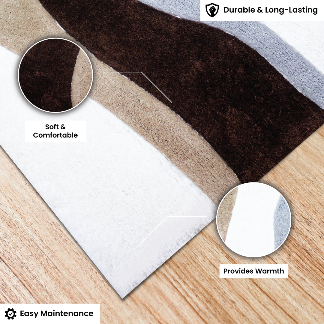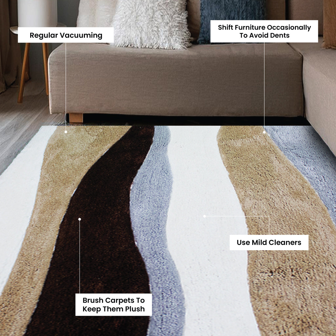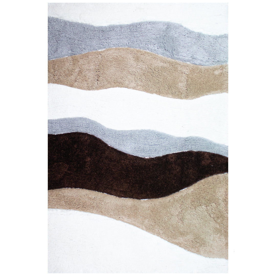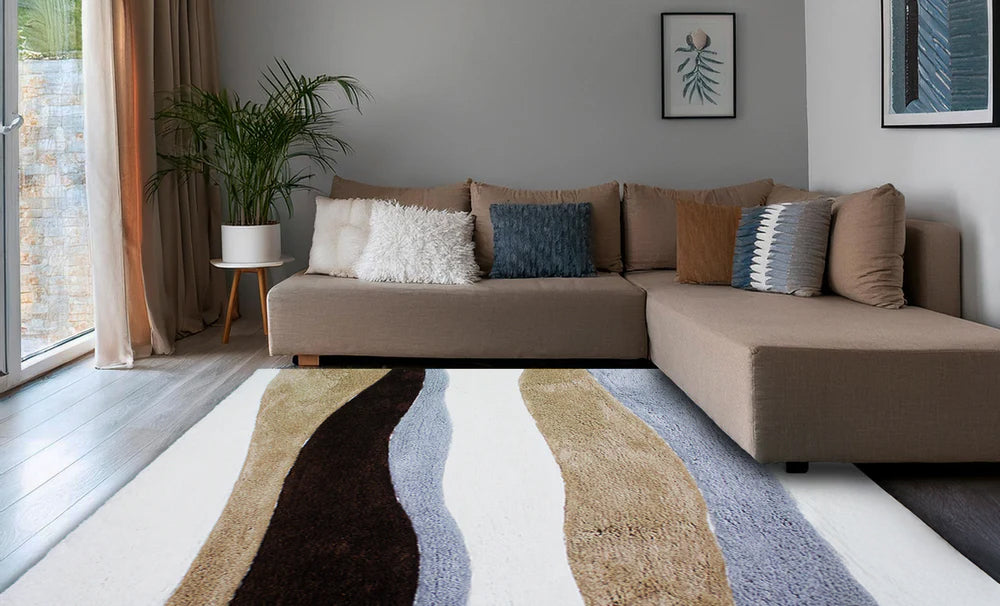 Flow into luxury with the Contemporary Thames, a sumptuous shaggy carpet from Rugs & Roses, crafted from ultra-soft microfiber yarn using advanced power loom techniques. This stunning piece features a stream-like pattern in rich brown, warm beige, crisp white, and tranquil blue, mirroring the graceful ebb and flow of a river. Its dynamic design infuses any space with a serene yet vibrant energy.