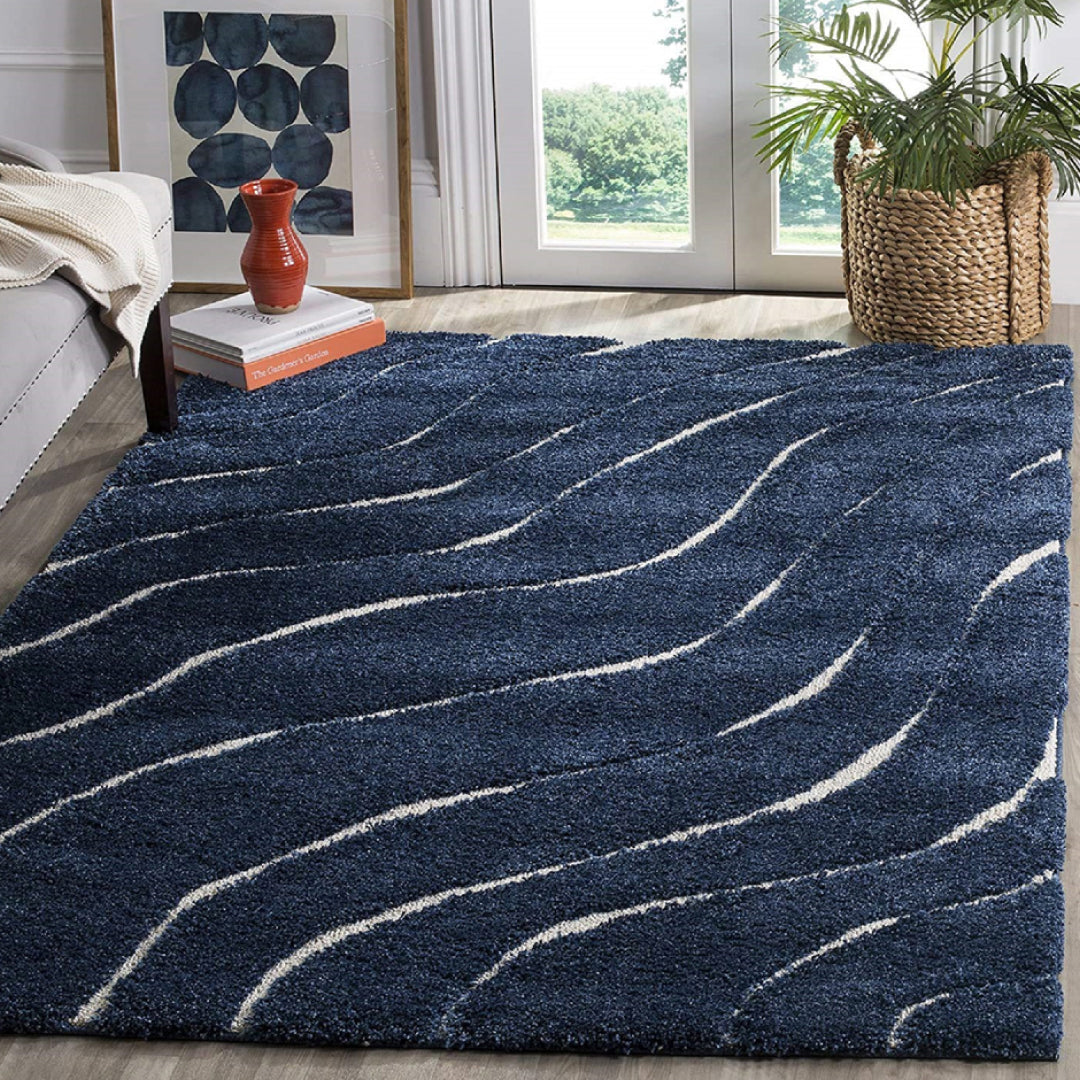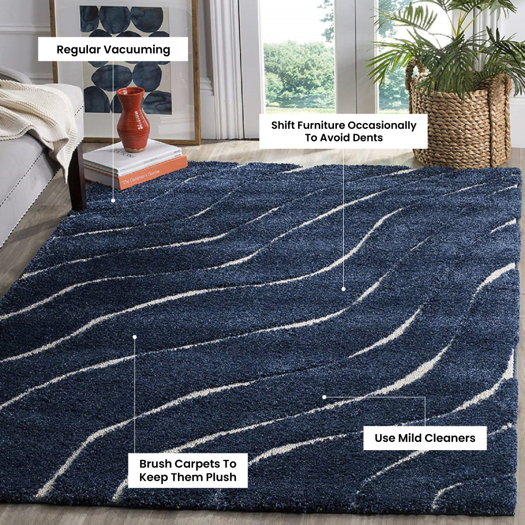 With a plush 1-2 inch deep pile, Velvet Weaves Indigo offers velvety softness and unparalleled comfort, while its high-density cotton backing ensures durability, non-slip stability, and enduring quality. The striking contrast of white wavy lines against the deep indigo shaggy surface creates a sophisticated, captivating look, perfectly suited for contemporary, minimalist, or eclectic interiors.