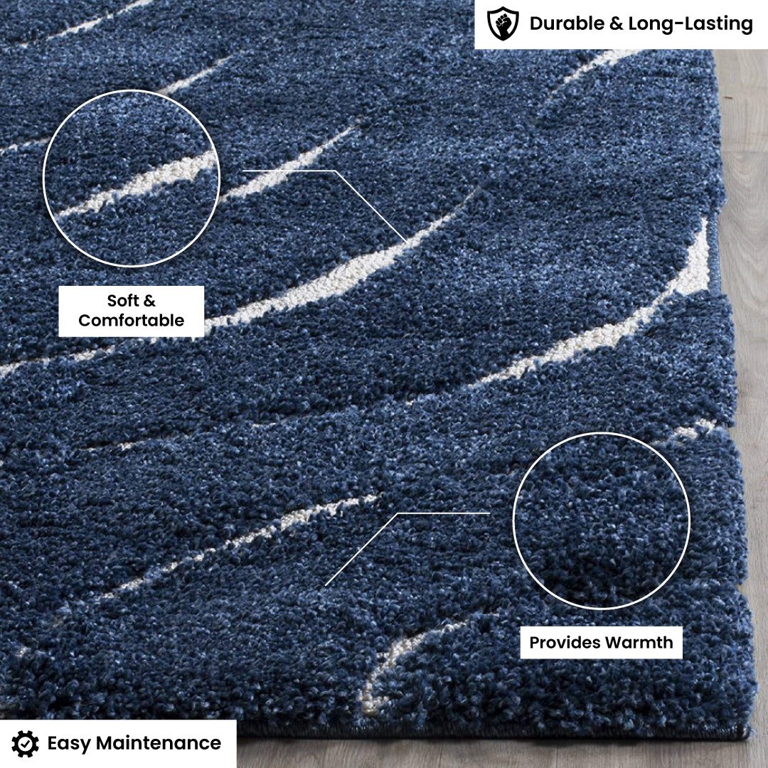Experience the pinnacle of contemporary luxury with Velvet Weaves Indigo, a shaggy masterpiece from Rugs & Roses’ Collection. Handcrafted by Bhadohi’s skilled artisans using ultra-soft microfiber yarn and cutting-edge power loom techniques, this stunning carpet features white, beach-like wavy lines flowing across a rich indigo-blue base, evoking the mesmerizing dance of waves against a twilight shore with a modern, artistic twist.